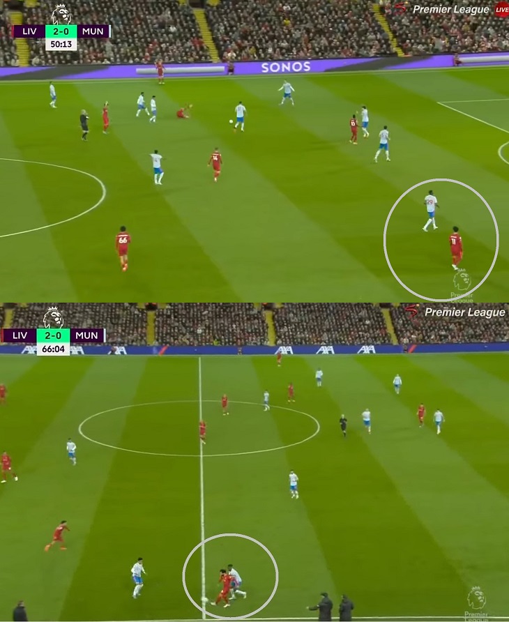 Была и адаптация под Салаха – тайм в апреле 2022-го. Ральф Рангник вышел с 3-5-2 (Далот левый вингбэк, Уан-Биссака правый), но перестроился на четверку в перерыве: убрал одного центрального защитника, а налево отправил Уан-Биссаку.