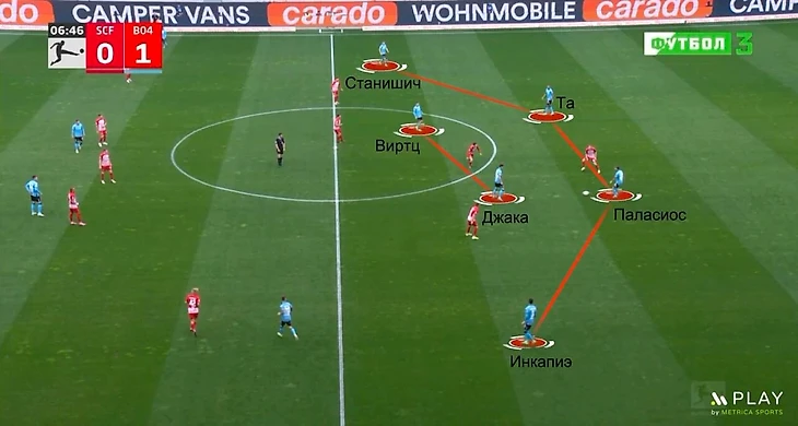 Классика розыгрышей «Байера» по ходу сезона-2023/24 – 3+2. Три центральных защитника Одилон Коссуну, Джонатан Та и Эдмонд Тапсоба, чуть выше располагаются опорники Гранит Джака и Эксекиэль Паласиос.