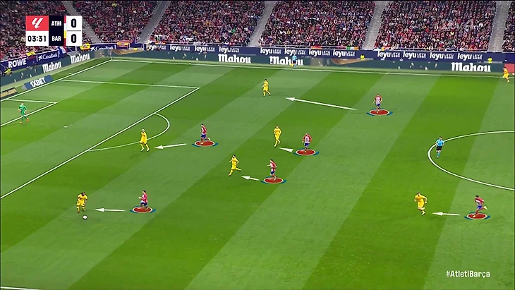 Здесь Чоло чуть преобразовал схему, чтобы она зеркалила структуру «Барсы» при владении. Структура 3-2-4-1 накладывалась на 3-4-3 у «Атлетико» – получались персональные дуэли по всему полю.