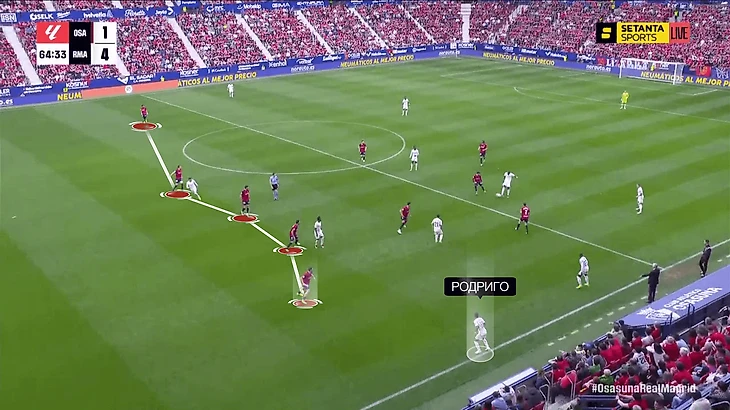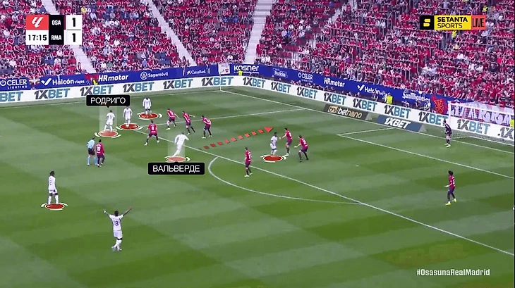 Наконец, четвертый гол. Рывком за спину Родриго вытянул за собой защитника, из-за чего сломалась офсайдная ловушка «Осасуны». Рюдигер и Вальверде благодарят бразильца за движение: