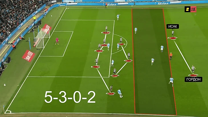 Не получилось. Во-первых, даже паркуясь, не были образцом надежности. Одна из причин – пара нападающих Гордон – Исак не участвовала в обороне. Из-за этого схема часто напоминала 5-3-0-2. «Сити» слишком легко переводил мяч и находил свободных игроков.
