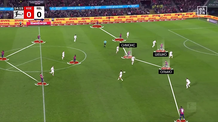 Крайние защитники поднимаются, опорник Шлагер опускается к ЦЗ, полузащитники сужаются – получаются четкие 3-1-5-1 с хорошо расположенными для комбинаций в центре игроками. Именно они – Ольмо, Шешко и Симонс – придумали комбинацию.
