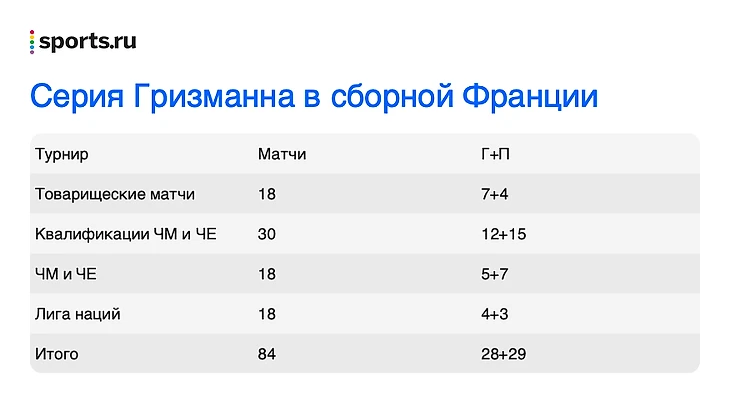 ● Гризманн провел уже 129 матчей за сборную: больше только у Лилиана Тюрама (142) и Уго Льориса (145). Достижимо!