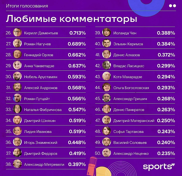 💥 Дмитрий Губерниев только 7-й. Его высоко оценили коллеги (редакция – 6-е место, комментаторы – 7-е), а вот пользователи поставили на 11-е.