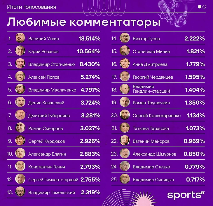 💥 Владимир Маслаченко – пятый (4.8%). Его особенно любят комментаторы (4-е место) и пользователи (5-е), а вот редакция поставила легенду только на 10-е место.