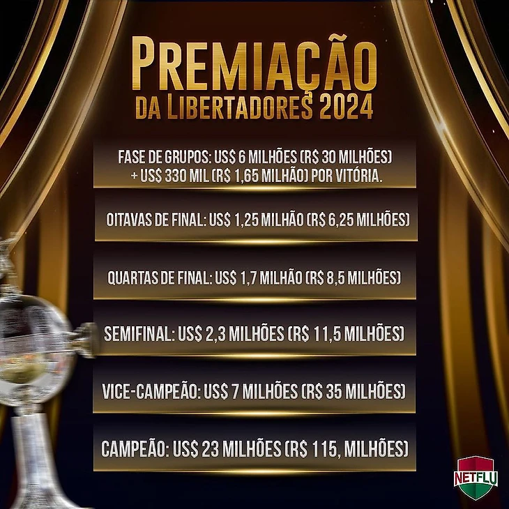 За победу в Либертадорес-2024 заплатят больше чем за аналогичное достижение в Лиге чемпионов (ненамного правда, все на миллион долларов, но все же). В Европе правда плюшки за победы и выход в следующий этап помягче и повкуснее.