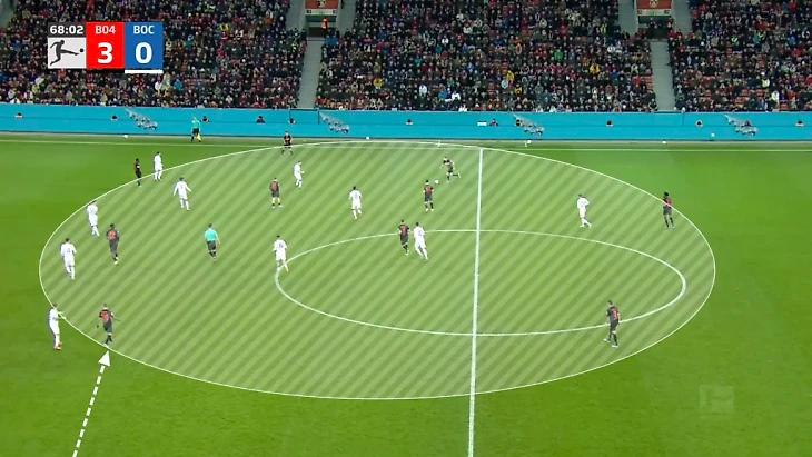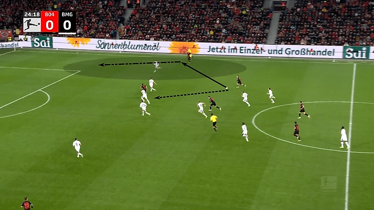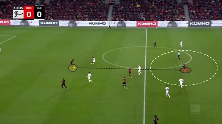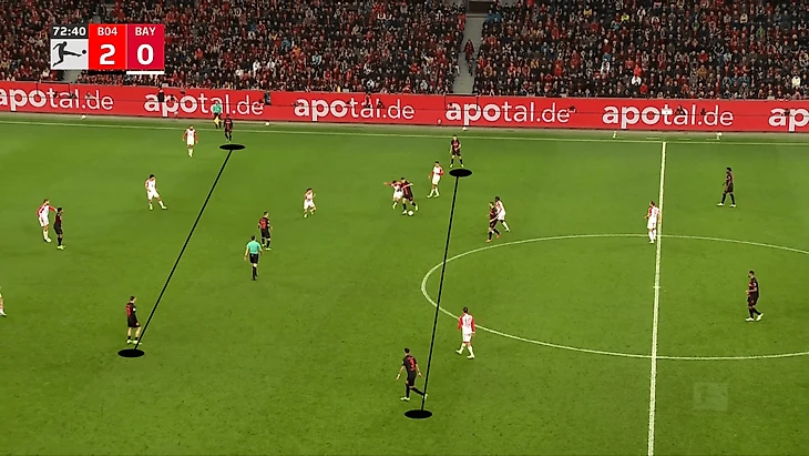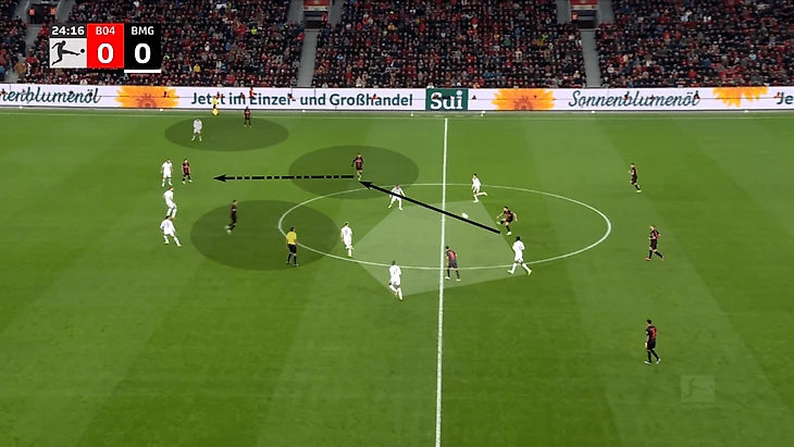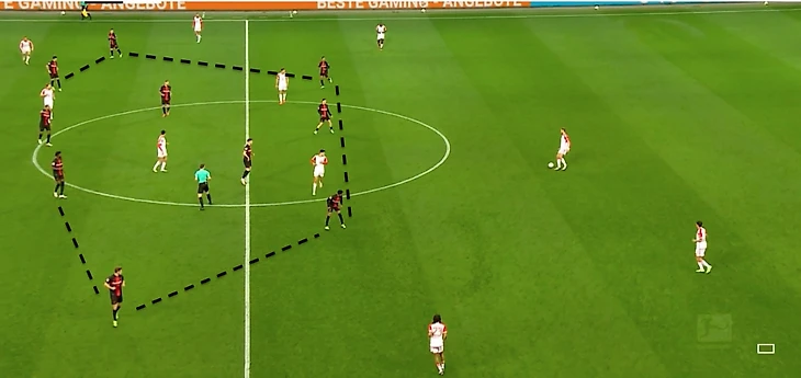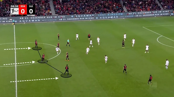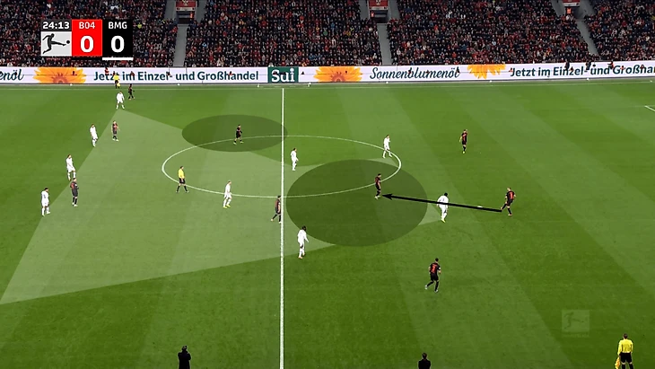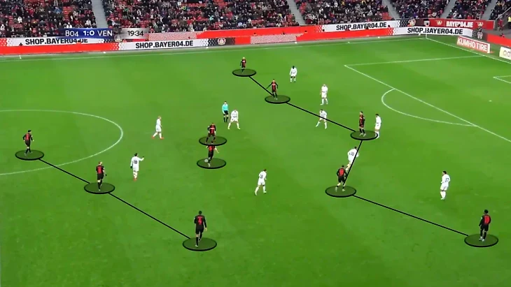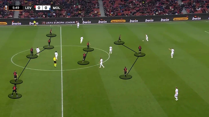Игроки Хаби Алонсо умеют хорошо использовать давление соперника и находить в нём дыры. Когда вингер прессингует центрального защитника «Байера 04», то позади него открывается пространство, в которое для получения передачи вбегает Хофманн или Вирц. В то же время Джака и Паласиос прикрыты полузащитниками соперника.