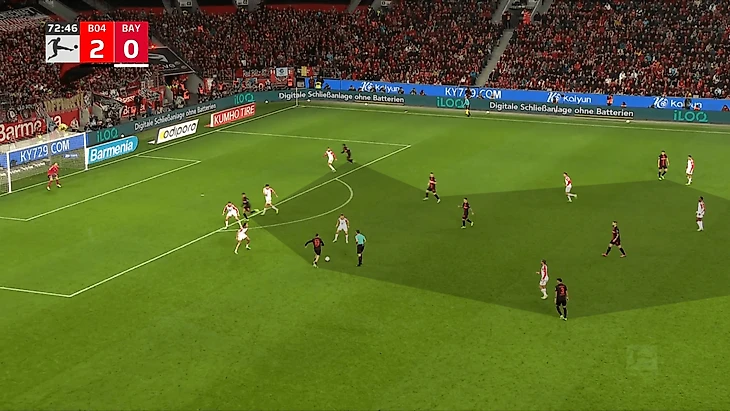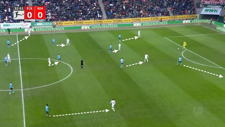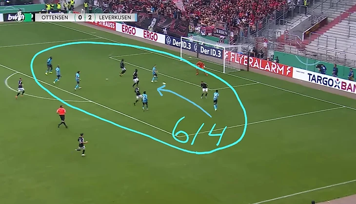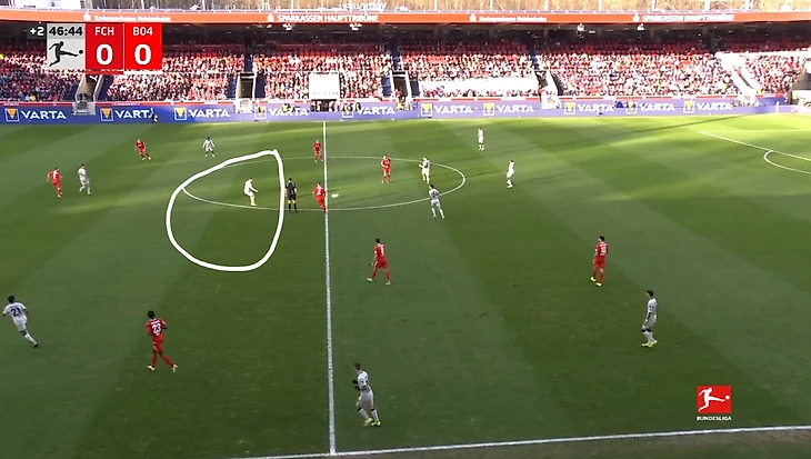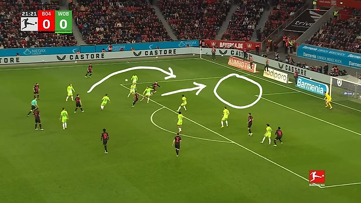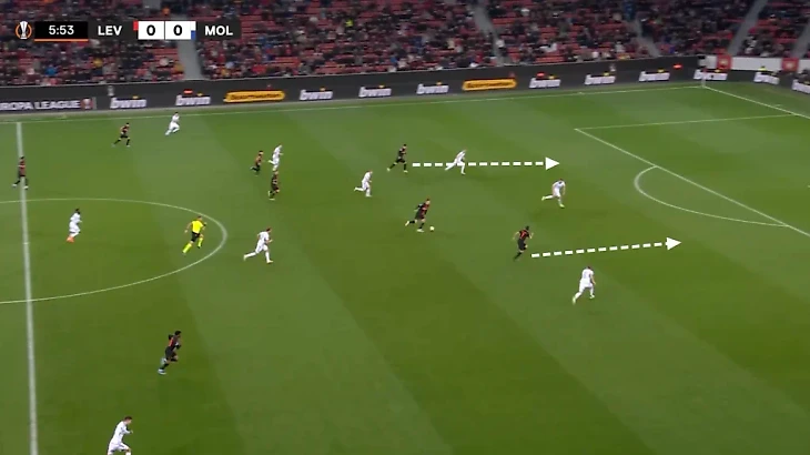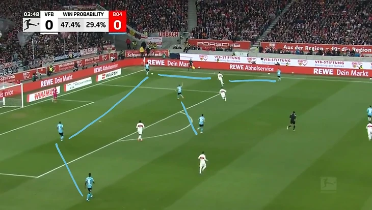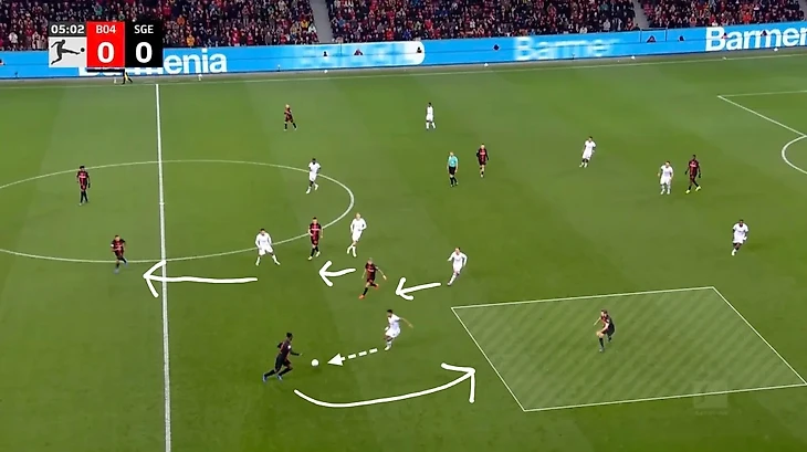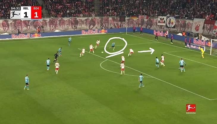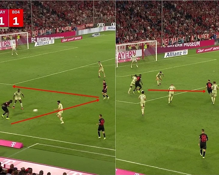Игроки Хаби Алонсо умеют хорошо использовать давление соперника и находить в нём дыры. Когда вингер прессингует центрального защитника «Байера 04», то позади него открывается пространство, в которое для получения передачи вбегает Хофманн или Вирц. В то же время Джака и Паласиос прикрыты полузащитниками соперника.