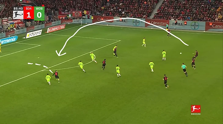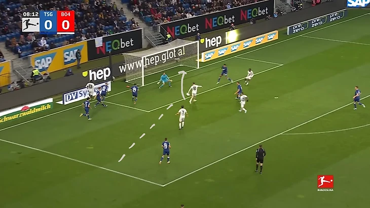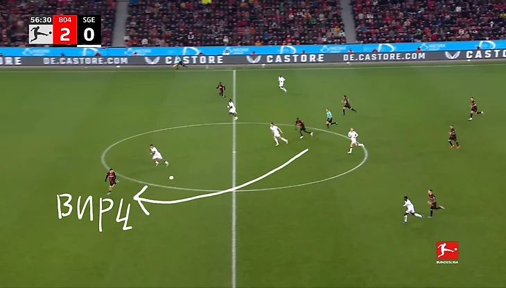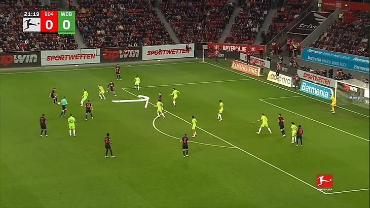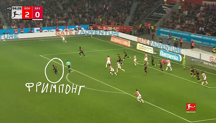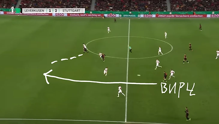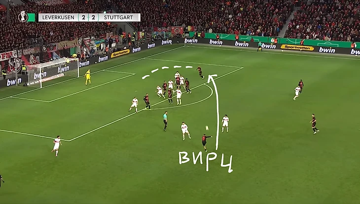 Также Вирц активно ищет на флангах Фримпонга и Гримальдо, отдаём им пас, чтобы те прострелили в штрафную соперника.