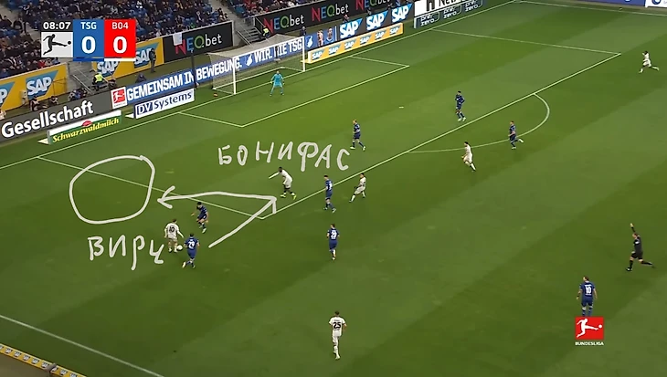 В матче с «Баварией» (ничья 2:2) Бонифас и Вирц вместе создали опасный момент. Бонифас привлёк внимание Упамекано и ещё нескольких игроков, дал пространство Вирцу для забега в штрафную и удара в штангу ворот.