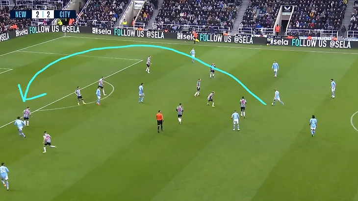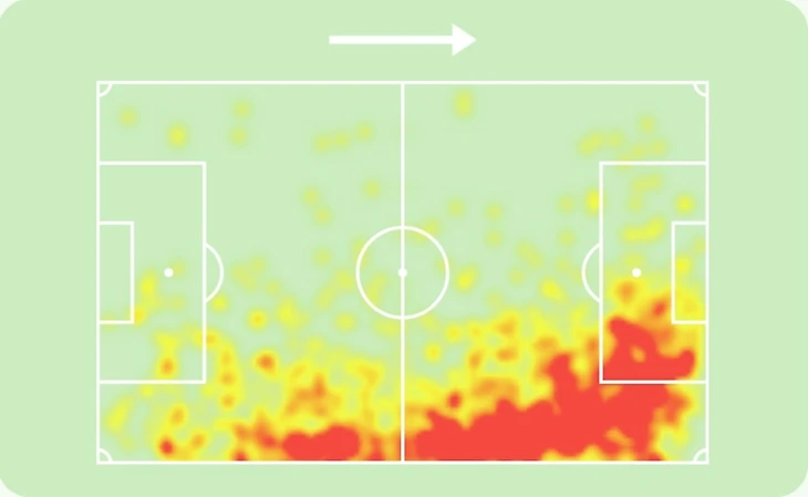 Этот ассиметричный подход вынуждает противника выстроить плотную защиту на одном фланге, а на противоположном фланге Гримальдо получает огромное пространство для действий. (в случае перевода мяча на него).