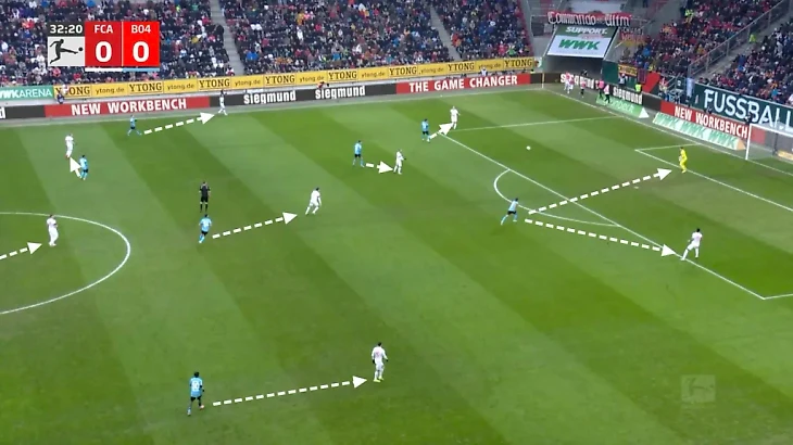 А Джереми Фримпонг остаётся в высокой позиции, чтобы обеспечить продвижение мяча впереди или же убежать в контратаку, если соперник допустит ошибку.