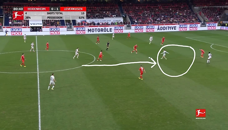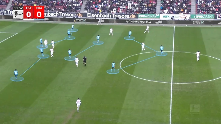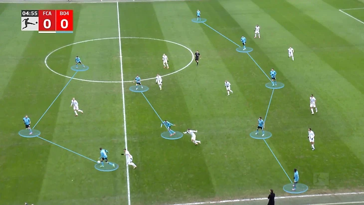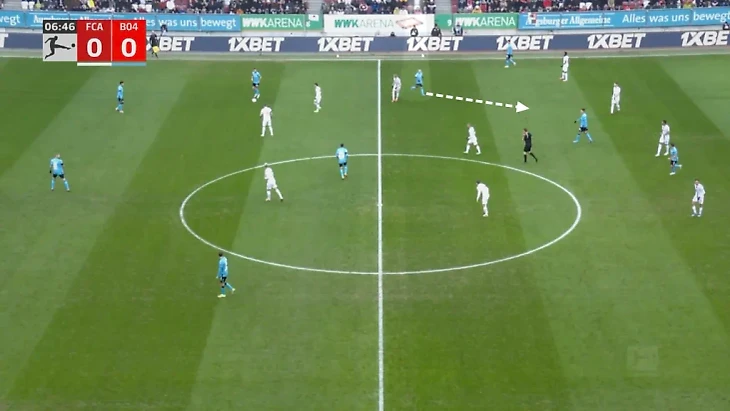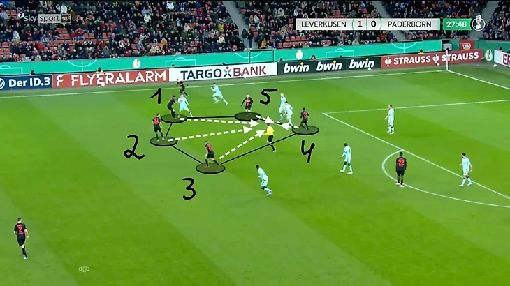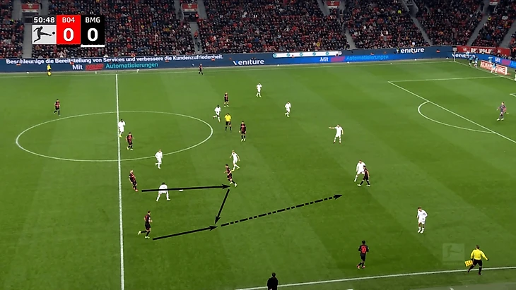 В данном случае Андрих пасует Джаке, а Станишич делает рывок вперёд и получает передачу от опорника. Получается своеобразный треугольник из Андриха, Джаки и Станишича. В результате «Байер 04» более уверенно закрепляется на половине поля соперника и продолжает атаку.