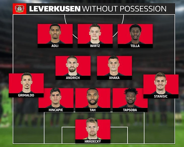 «Байер 04» использует схему 5-2-3 за счёт ухода Фримпонга и Гримальдо в защиту. Они распологаются в среднем блоке, стараясь сохранять компактность и закрыть центр. Этим объясняется высокая линия защиты, чтобы сделать пространство до полузащиты как можно меньше.