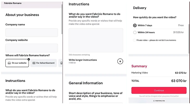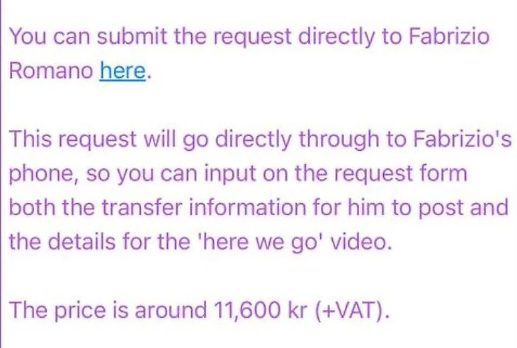 В соцсетях распространяют скриншот переписки с таким клиентом: «Этот запрос придет напрямую в телефон Фабрицио, поэтому вы можете ввести в форму как трансферную информацию, которую вы хотите опубликовать, так и детали для видео Here we go. Цена составит около 11600 норвежских крон (1097 долларов) + НДС».
