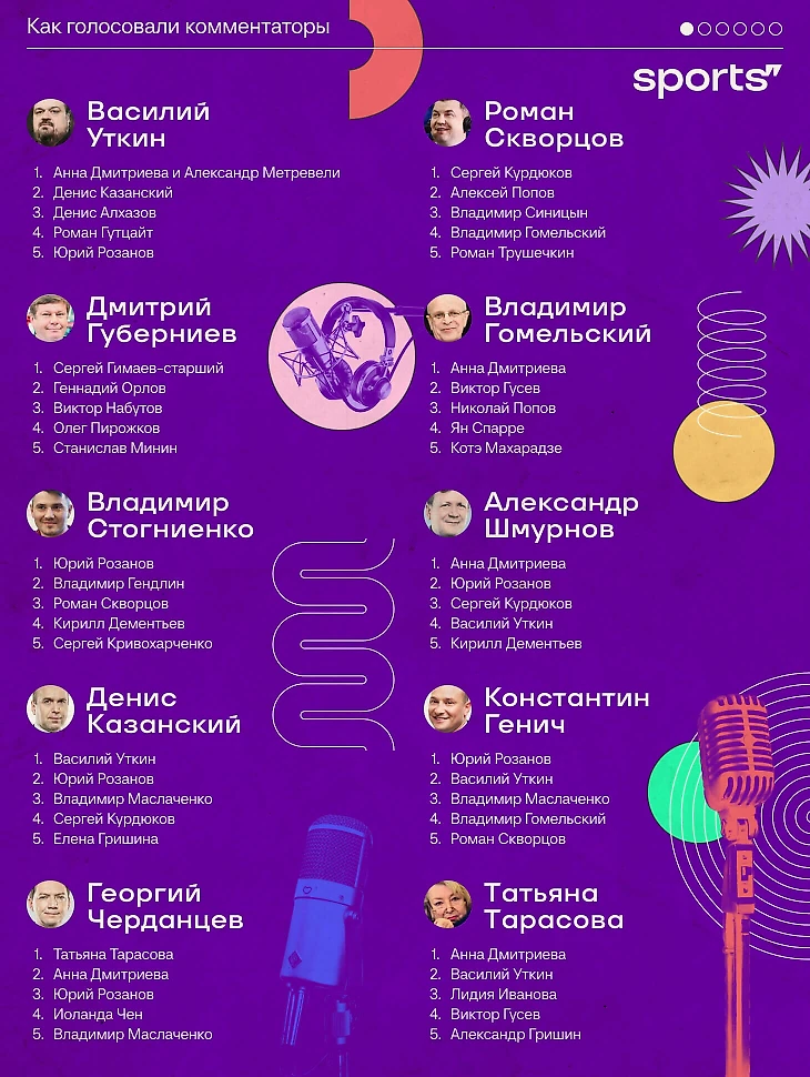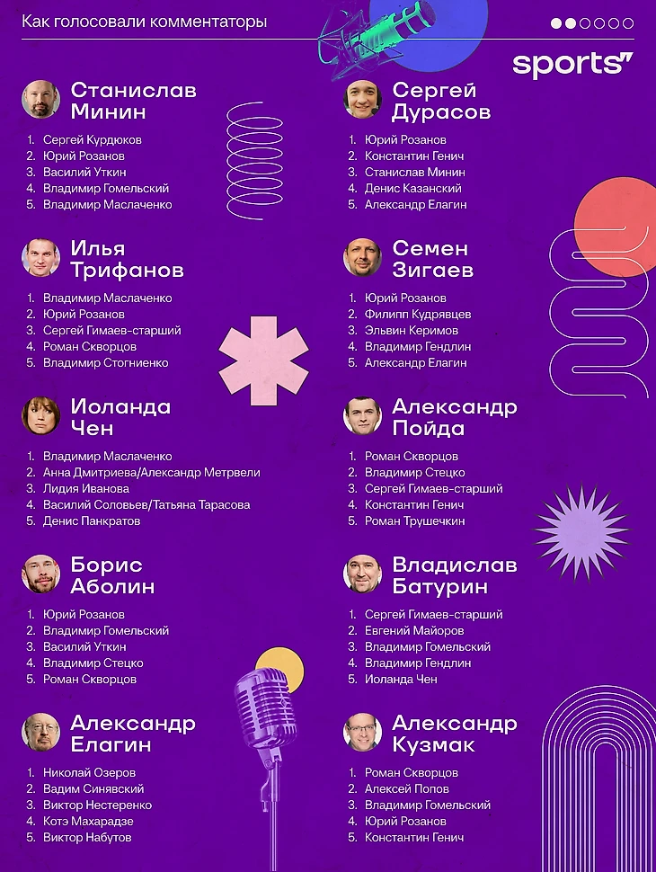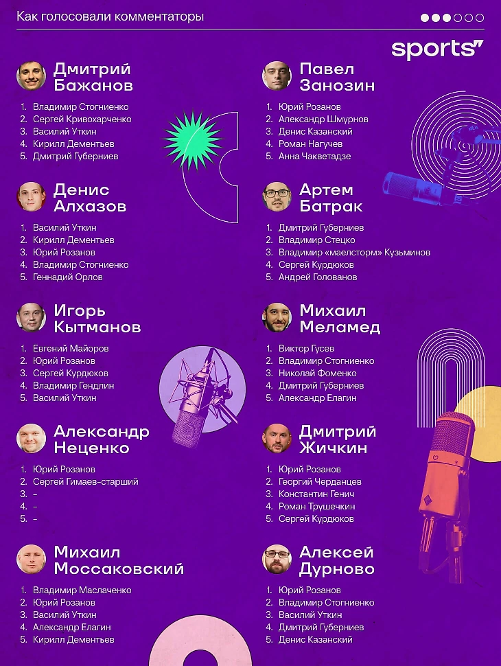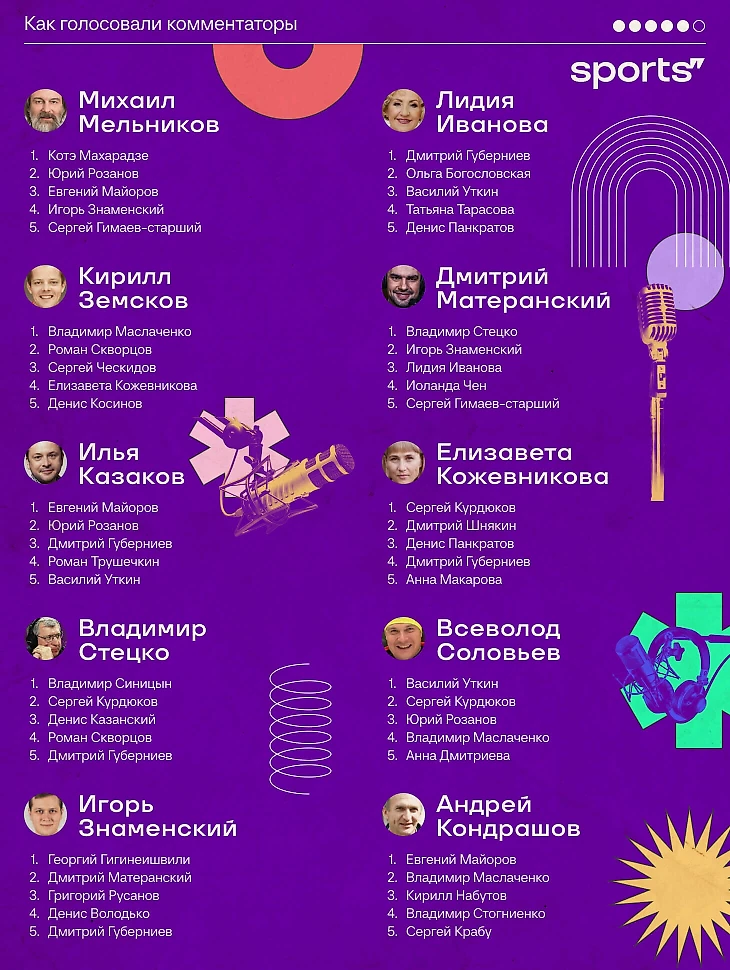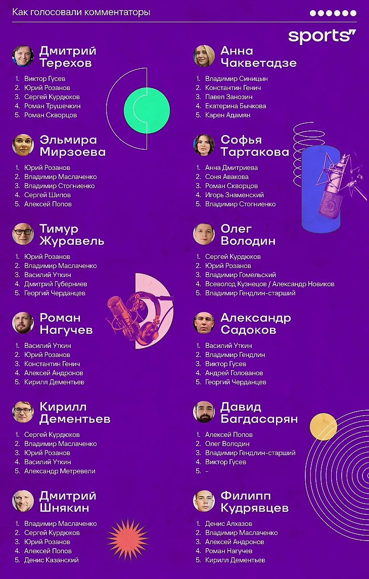 Мы обещали, что опубликуем не только общие итоги проекта «Любимый комментатор», но и отдельно покажем, как голосовали сами комментаторы. Без их мнения, лидеров профессии, голосование выглядело бы не совсем честным, релевантным и верифицированным.