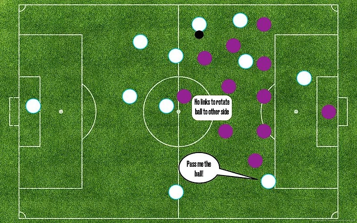 Эффективность прессинга «Баварии» под руководством Флика во многом обусловлена ее второй волной (ниже). Используя схему 4-2-3-1, их атака борется за то, чтобы помешать и не дать сопернику продвинуться вперёд. Поэтому они полагаются на своих крайних защитников и опорную зону, удерживая владение мячом на широких пространствах. Когда они это делают, то сокращают возможности своих оппонентов и приводят к многочисленным ошибкам, которые те совершают в центре поля.