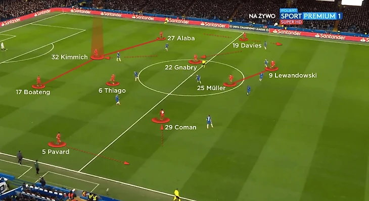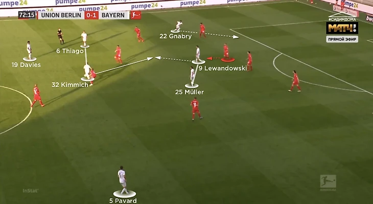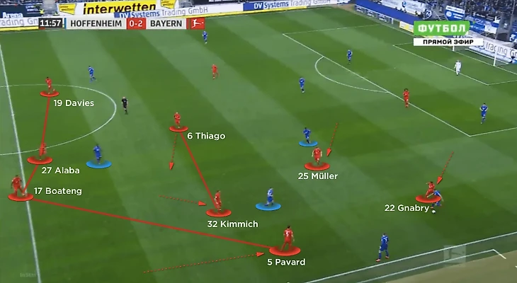 Флик создавал крошечные пространства в штрафной соперника для забегов скоростных Комана и Гнабри. Левандовски вытягивает за собой защитника, провоцируя Киммиха на пас в свободную зону для Гнабри(ниже)