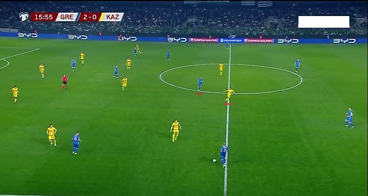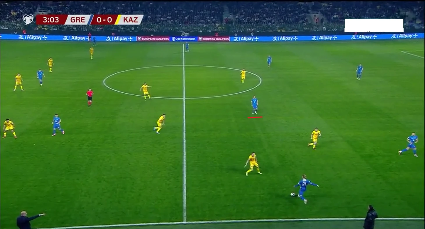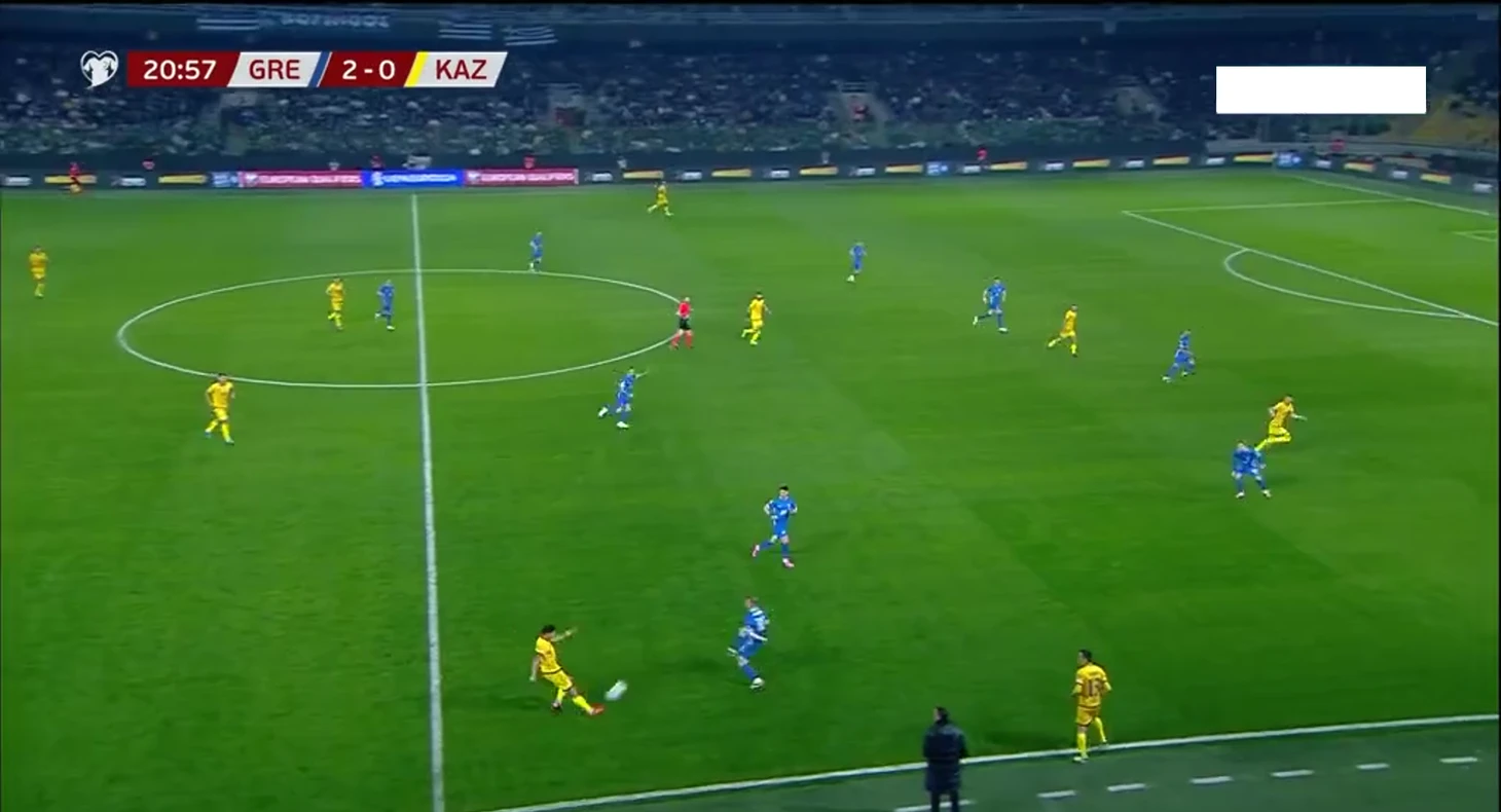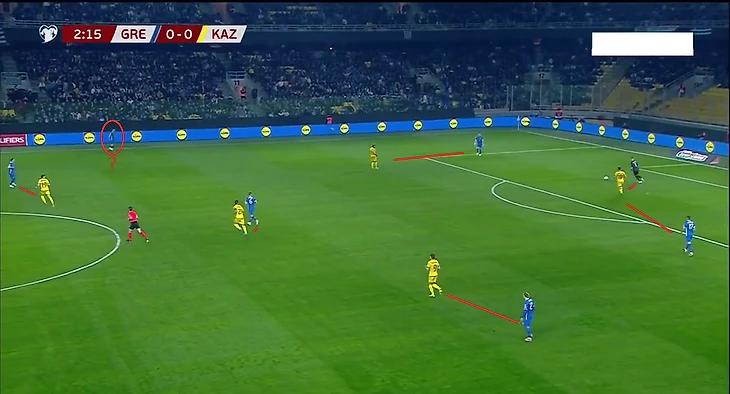 Казахстан с первых минут шел высоко прессинговать, пытаясь мешать коротким розыгрышам греков. Но этот план не удался, поскольку главной проблемой была несогласованность давления. Нападающие и полузащитники (а иногда и латерали) не понимали, когда выбирать момент для выдвижения, что создавало разрывы между линиями и часто оставляло свободного игрока у Греции.