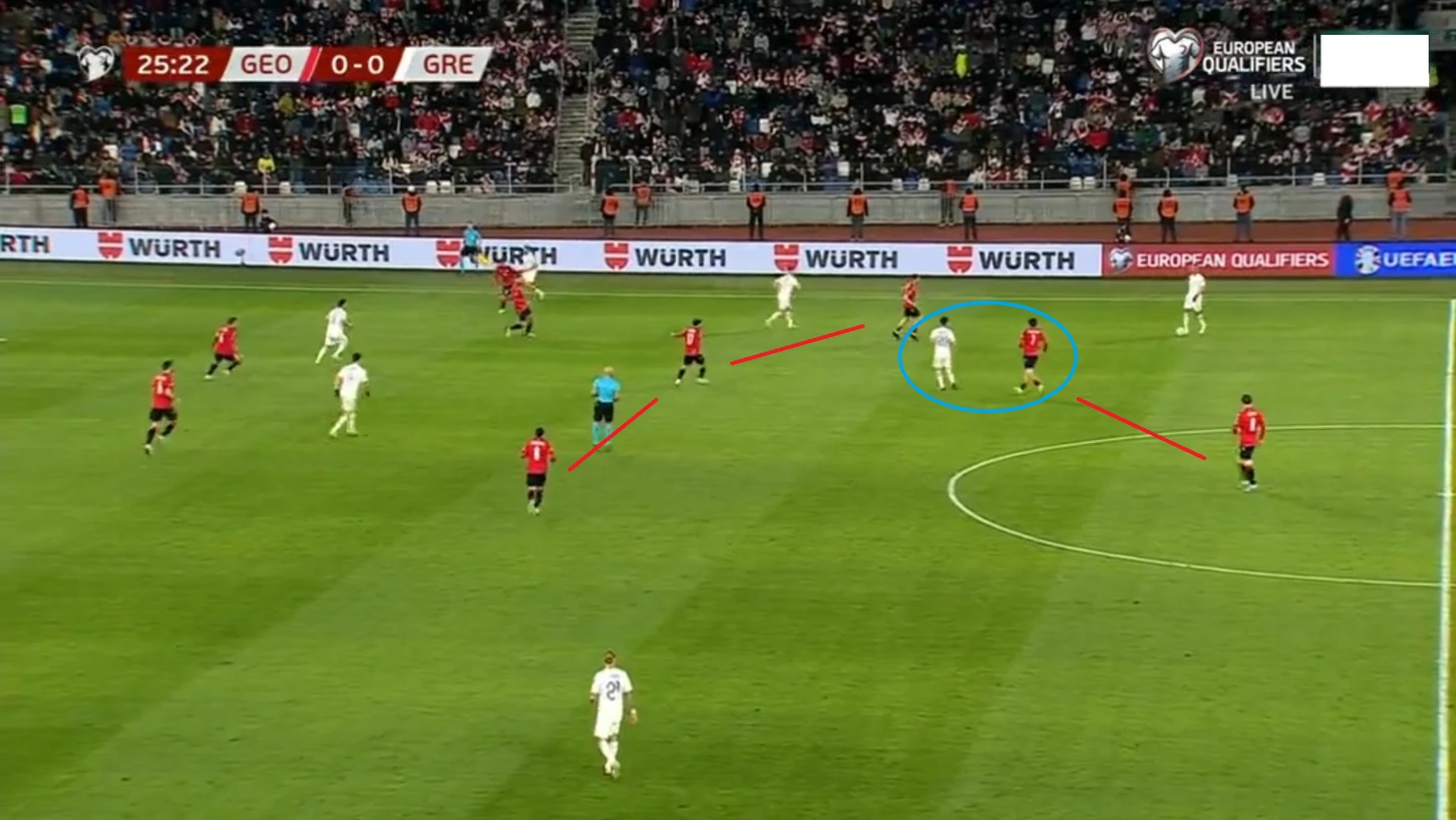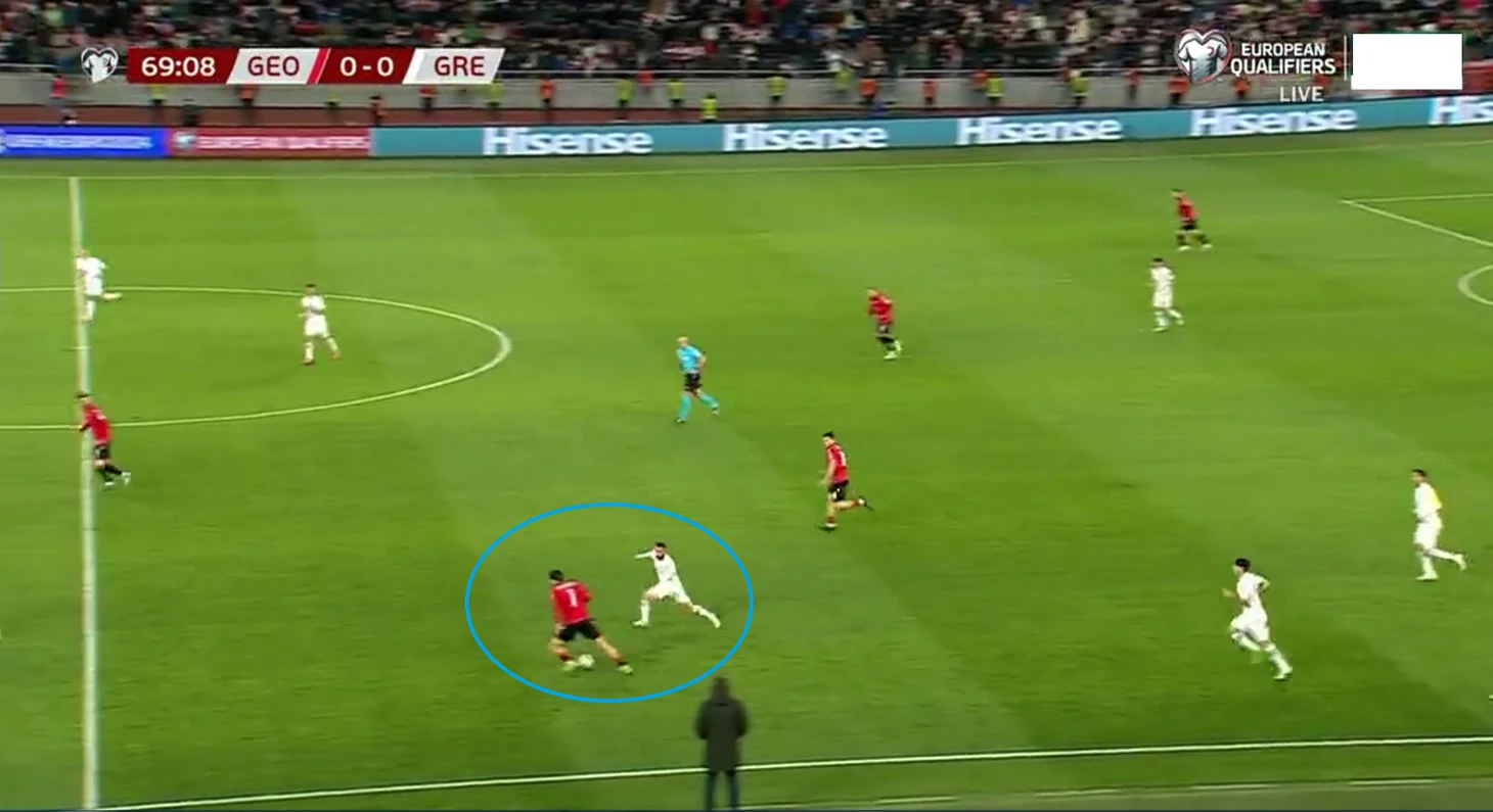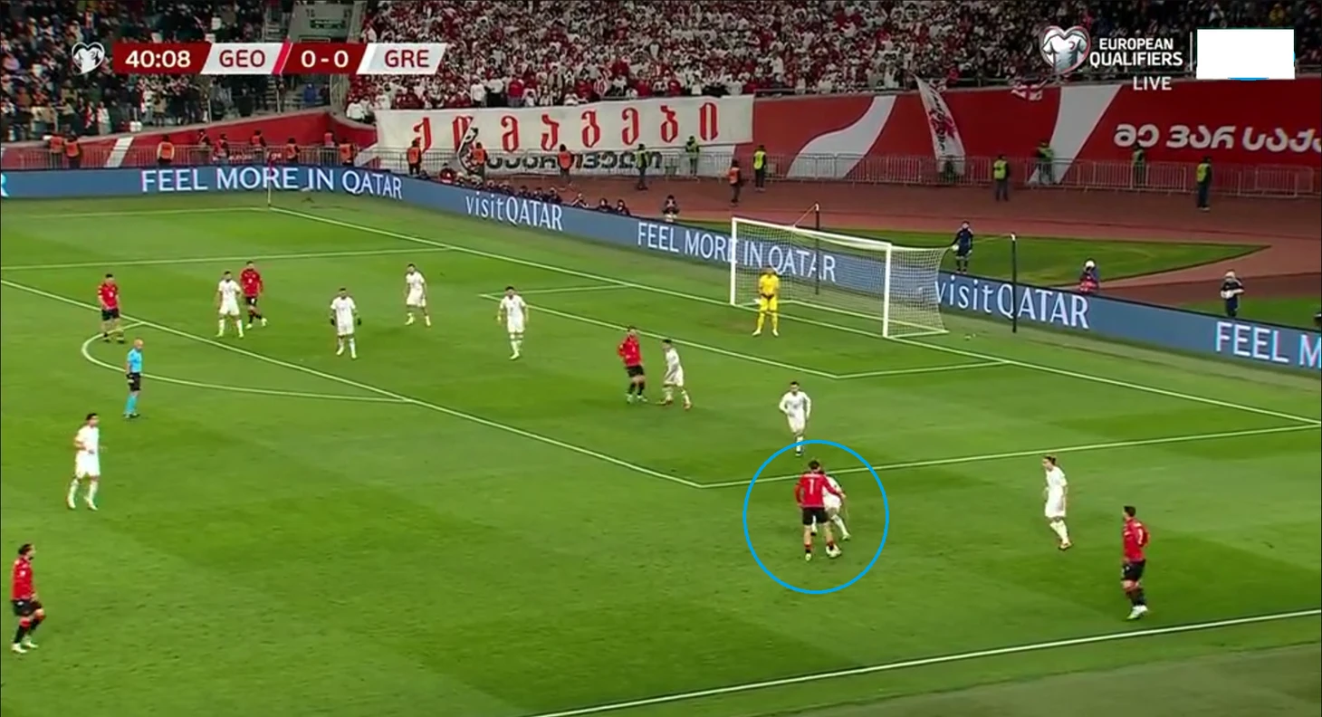 Грузия же была более терпеливой и опускалась всей командой на свою половину поля. В похожих моментах один из центрнапов оставлял цз свободным и шел за опорником, не давая пространства для розыгрышей на фланге. Здесь крайкам Греции оставалось либо делать заброс вперед в борьбу, либо отдавать обратно на центрального защитника, что просто запускало перекат с фланга на фланг. Таким образом футболистам Грузии удавалось делать владение греков стерильным, а за первый тайм они допустили по своим воротам только один удар (0.03 xG).