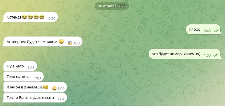 – Я тут хочу обнародовать одну историю. Когда я только погружался в бельгийский футбол в прошлом году, я посмотрел все команды по одному разу и написал Артему, что «Антверпен» будет чемпионом. А он тогда тоже отставал прилично – не так сильно, как сейчас, но все же. Артем тогда, наверное, подумал, что пришел какой-то городской сумасшедший. Был такой разговор?