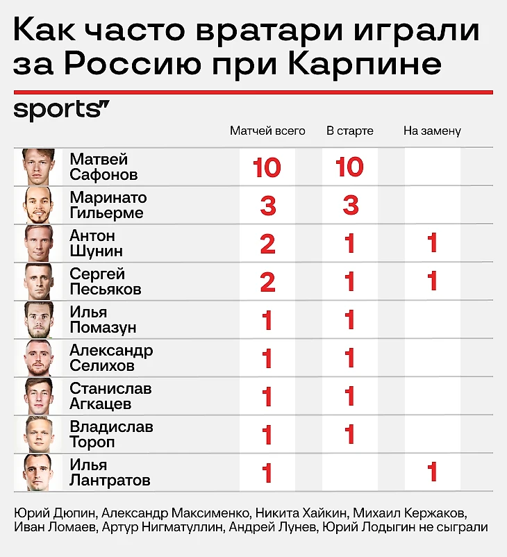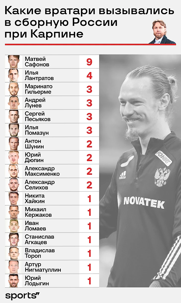 Среди всех вратарей Карпина ожидаемо лидирует Матвей Сафонов. Примечание: здесь мы учитывали только окончательные вызовы на матчи – без учета расширенного списка и обычных сборов.