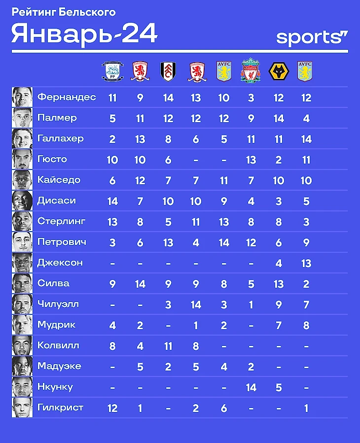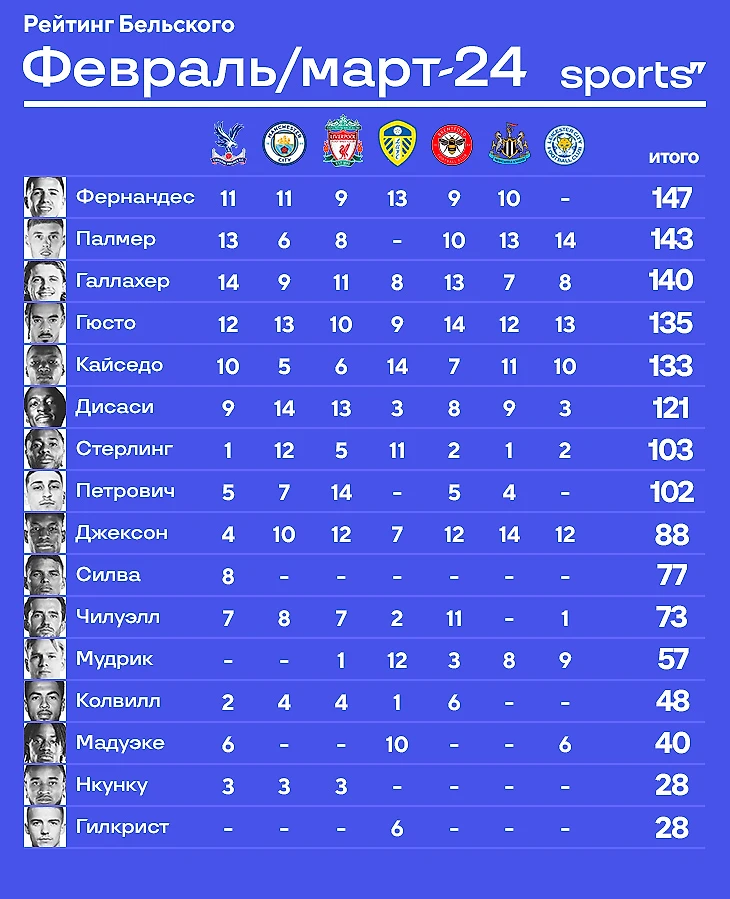 Конор Галлахер не вышел в старте лишь в игре с «Престоном», но зато появился во всех 15 матчах за этот отрезок наряду с Акселем Дисаси, Рахимом Стерлингом и Мойсесом Кайседо. Забивал в двух матчах подряд важные мячи (с «Виллой» и «Пэлас»), однако в последних встречах выглядел не так энергично, как в январе. Именно поэтому в этот раз он не оказался на первой строчке, что закономерно.