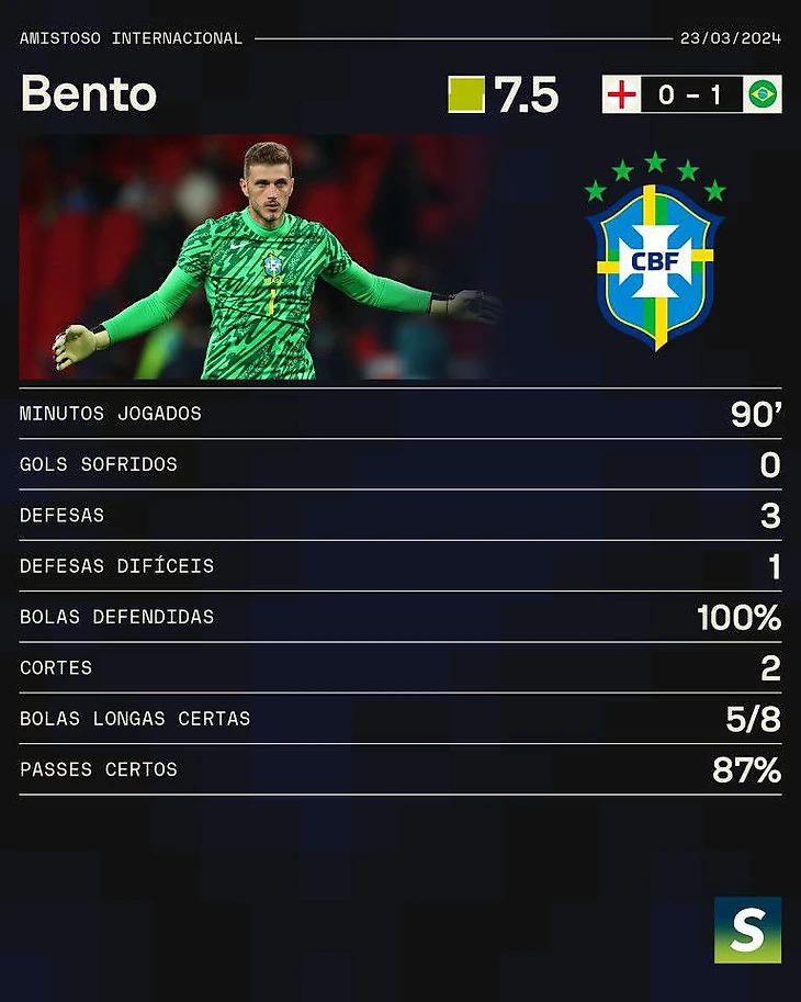 Бенто сыграл спокойно и надежно. Его правда англичане особо не «гоняли по билету», но экзамен молодой вратарь, думаю, сдал.