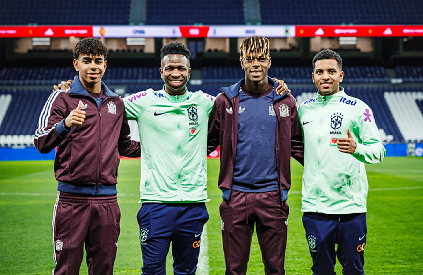 «В футболе единственный цвет, который нас отличает, – это цвет футболки», – слова из заявления Королевской испанской футбольной федерации (RFEF). Винисиус, Родриго, Ламин Ямаль и Нико Уильямс сделали совместное фото.