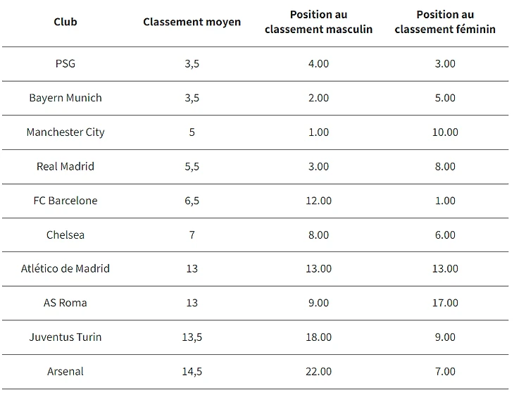 «Бавария» и «ПСЖ» — единственные клубы, чьи женские и мужские команды вошли в пятерку лучших в обоих рейтингах.