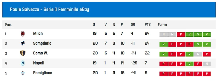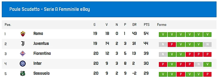 Турнирная таблица женской Серии А после двадцатого тура: