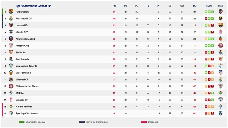 • Тур закрывало Эль-Класико, где уже традиционно побеждает «Барселона». Фридолина Рольфё замкнула прострел Оны Батлье – это второй гол шведки во второй игре в стартовом составе. Ирене Паредес же едва не замкнула прострел Ольги Кармоны в свои ворота – спасла штанга. Айтана Бонмати не смогла наказать Мису Родригес за привоз, но исправилась во второй половине с передачи Каролин Грэм Хансен. Лучшая футболистка в свою очередь ассистировала на Хансен, у которой уже 51 очко по системе «гол+пас» (заявка на Золотой мяч?). Под занавес встречи «сливочные» нанесли первый удар по воротам гостей. «Барса» в 16-й раз побеждает у заклятых врагов во всех турнирах.