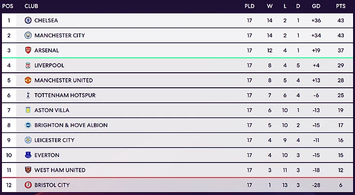 Турнирная таблица женской Суперлиги ФА после семнадцатого тура: