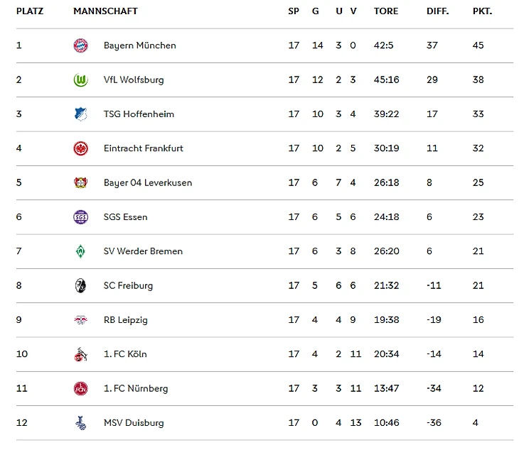 Турнирная таблица женской Бундеслиги после семнадцатого тура: