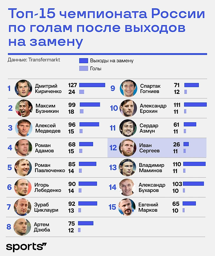 Для одиннадцати голов Сергееву понадобилось всего 26 выходов на замену. Ерохину, Сердару Азмуну и Владимиру Маминову для такого результата требовалось гораздо больше матчей.