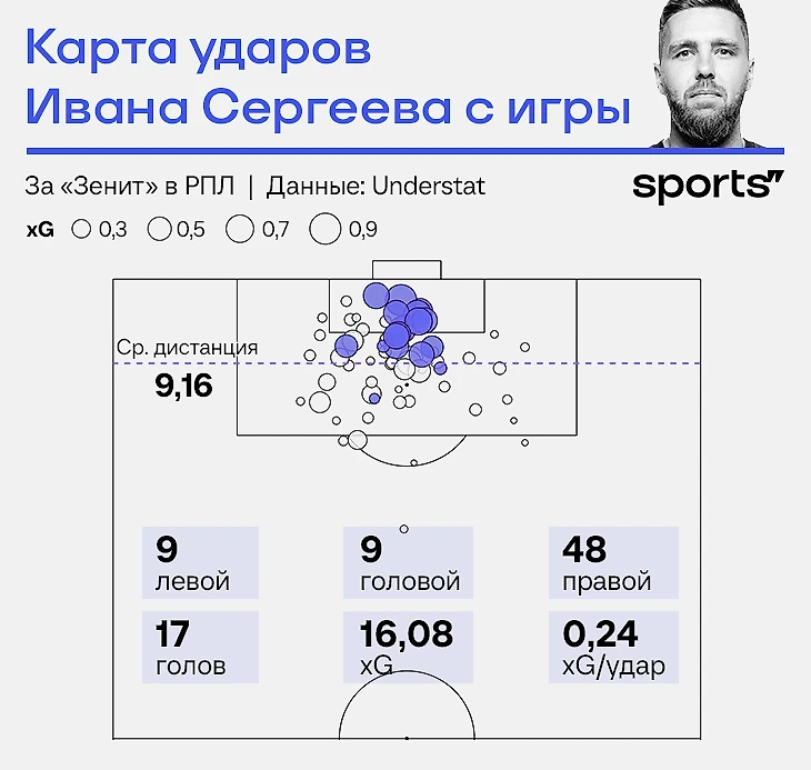 Несмотря на прогресс в подыгрыше, главная сила Сергеева – все еще игра в штрафной. За три неполных сезона в «Зените» Иван нанес всего четыре удара с дистанции (за полгода в «Крыльях» – 11), все голы в РПЛ – из штрафной. 13 голов из 20 за «Зенит» Сергеев положил из вратарской.
