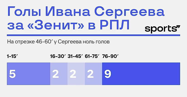 Эффективность Сергеева после выходов на замену впечатляет и на уровне РПЛ: после дебюта Ивана в лиге никто не забивал так больше, чем он (11, у Вильзона Изидора – 8 голов).