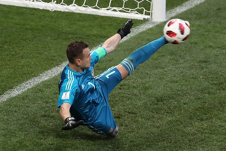 Капитан сборной России на домашнем чемпионате мира по футболу 2018. Отстоял на ноль в матче-открытии чемпионата против сборной Саудовской Аравии, завершившемся победой сборной России (5:0). В группе сборная России заняла второе место с 6 очками, победив также Египет и уступив Уругваю, и вышла в 1/8 финала, где соперником стала сборная Испании. Акинфеев выходил в стартовом составе во всех матчах сборной. Встреча с испанцами проходила 1 июля на стадионе Лужники. Основное и дополнительное время матча завершились со счётом 1:1, в серии послематчевых пенальти Акинфеев отразил удары Коке и Яго Аспаса, а все четыре удара сборной России были точны, в результате чего команда вышла в 1/4 финала. Акинфеев был признан лучшим игроком матча, а его последний «сэйв», в котором он ногой выбил мяч после удара Аспаса, получил неофициальное название «нога бога». В четвертьфинальном матче против Хорватии (2:2), также закончившемся серией послематчевых пенальти, отразил удар Матео Ковачича, но россияне проиграли, не забив два пенальти. По итогам ЧМ-2018 он был награждён орденом Почёта.