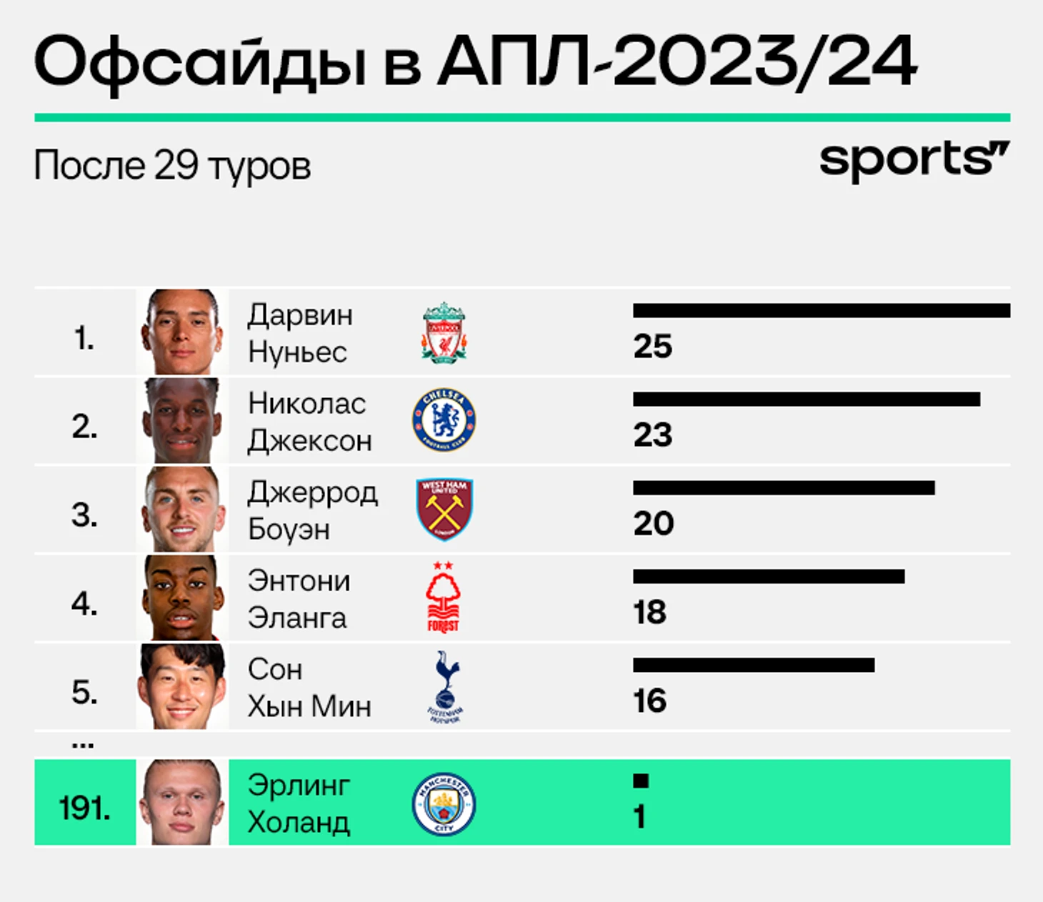 Такой стиль часто провоцирует офсайды – выдерживать линию и попадать в тайминг тяжело. Особенно с ВАР. У Дарвина, например, 25 офсайдов, он лидер лиги. У Николаса Джексона – 23, у Сона – 16.