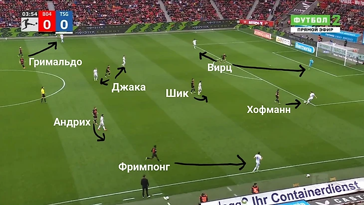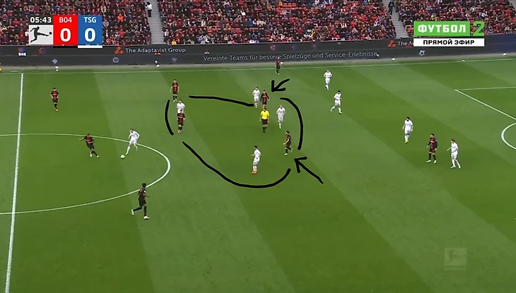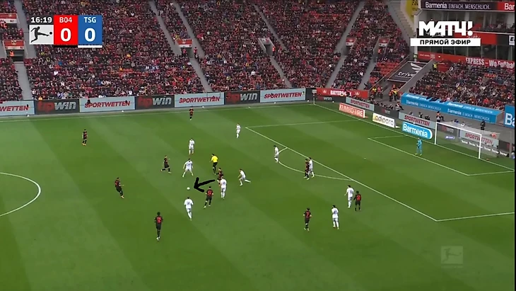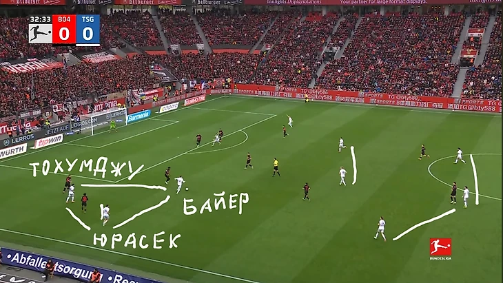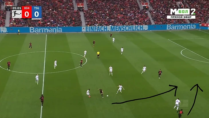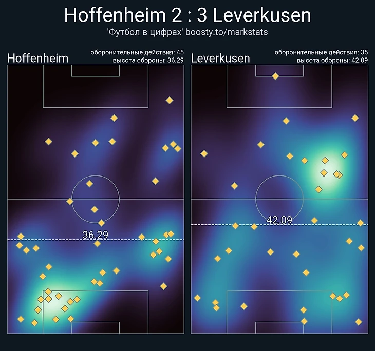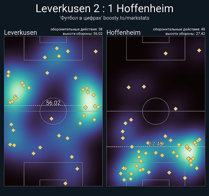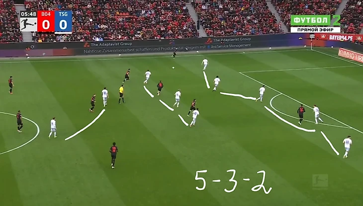 «Хоффенхайм» оборонялся по схеме 5-3-2, стараясь не садиться глубоко, а сдерживать «Байер 04» в среднем блоке.