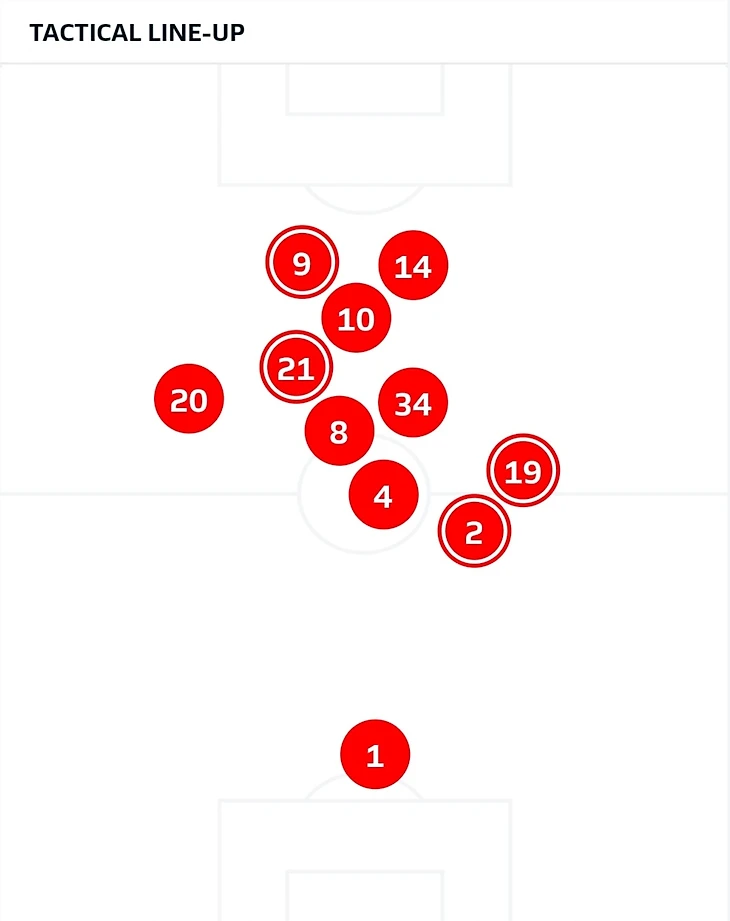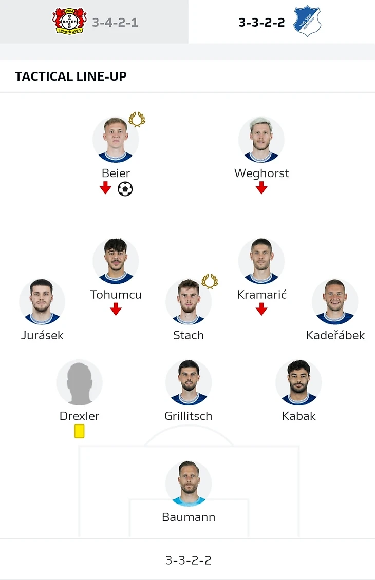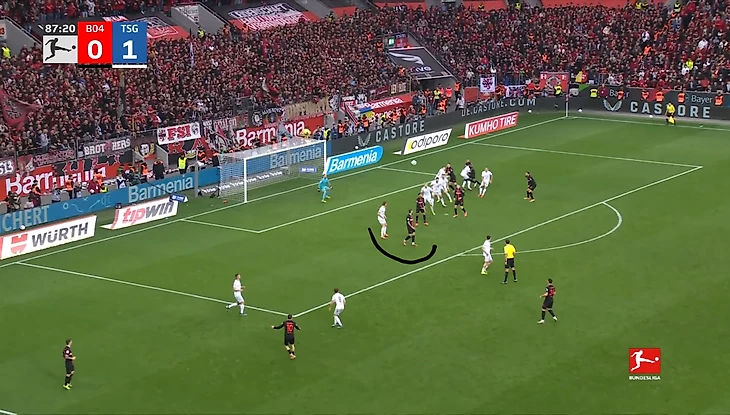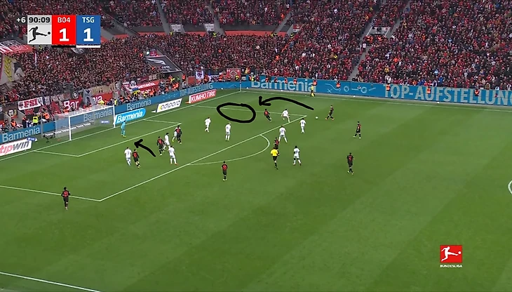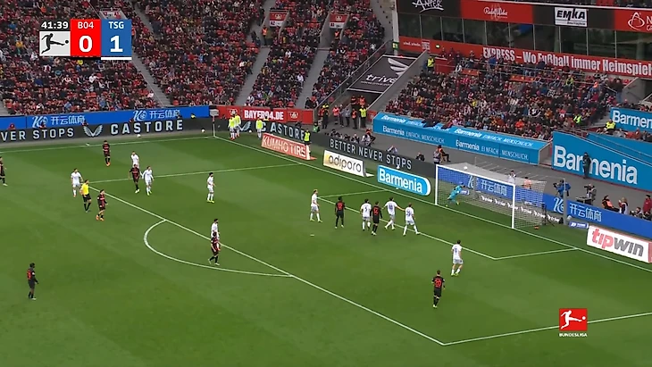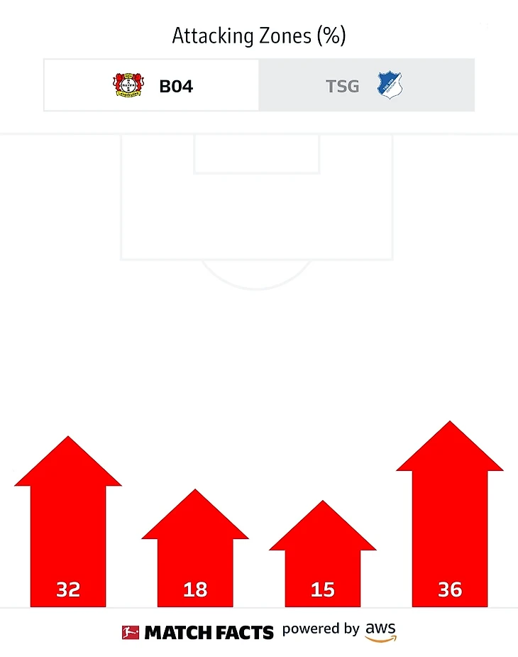 Выход Иглесиаса и Адли добавили «Байеру 04» атакующей силы, позволяя больше насыщать штрафную игроками соперника. Вирц (10) стал распологаться в центре, Шик и Иглесиас (14 и 9) на острие атаки, а Адли (21) играл чуть ниже. В результате «Байер 04» завладел мячом 72% против 28% у «Хоффенхайма» и нанёс 23 удара по воротам, из которых 8 пришлись в створ, что позволило выбить 3,75 xG! Это самый высокий высокий показатель в 27-ом туре!