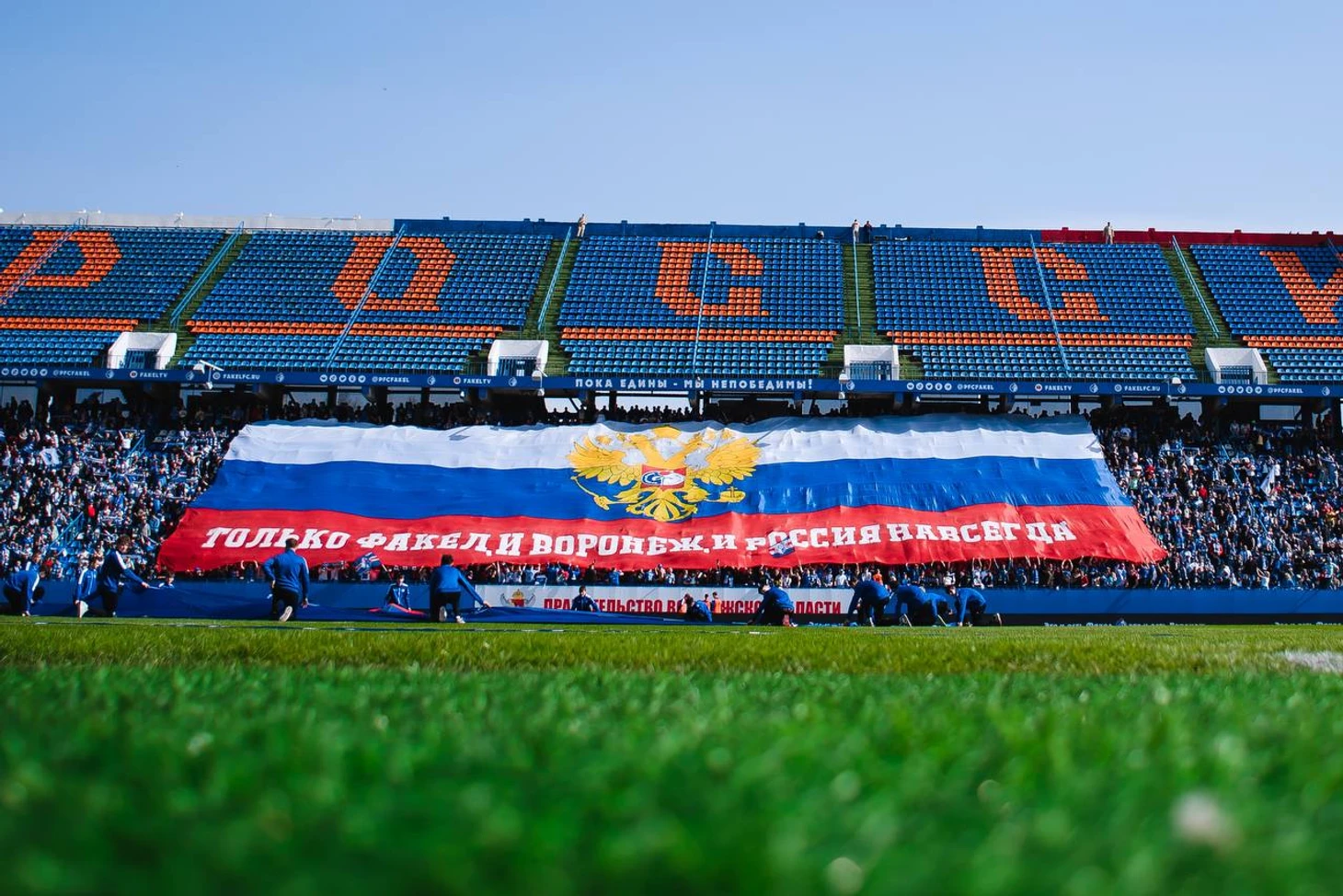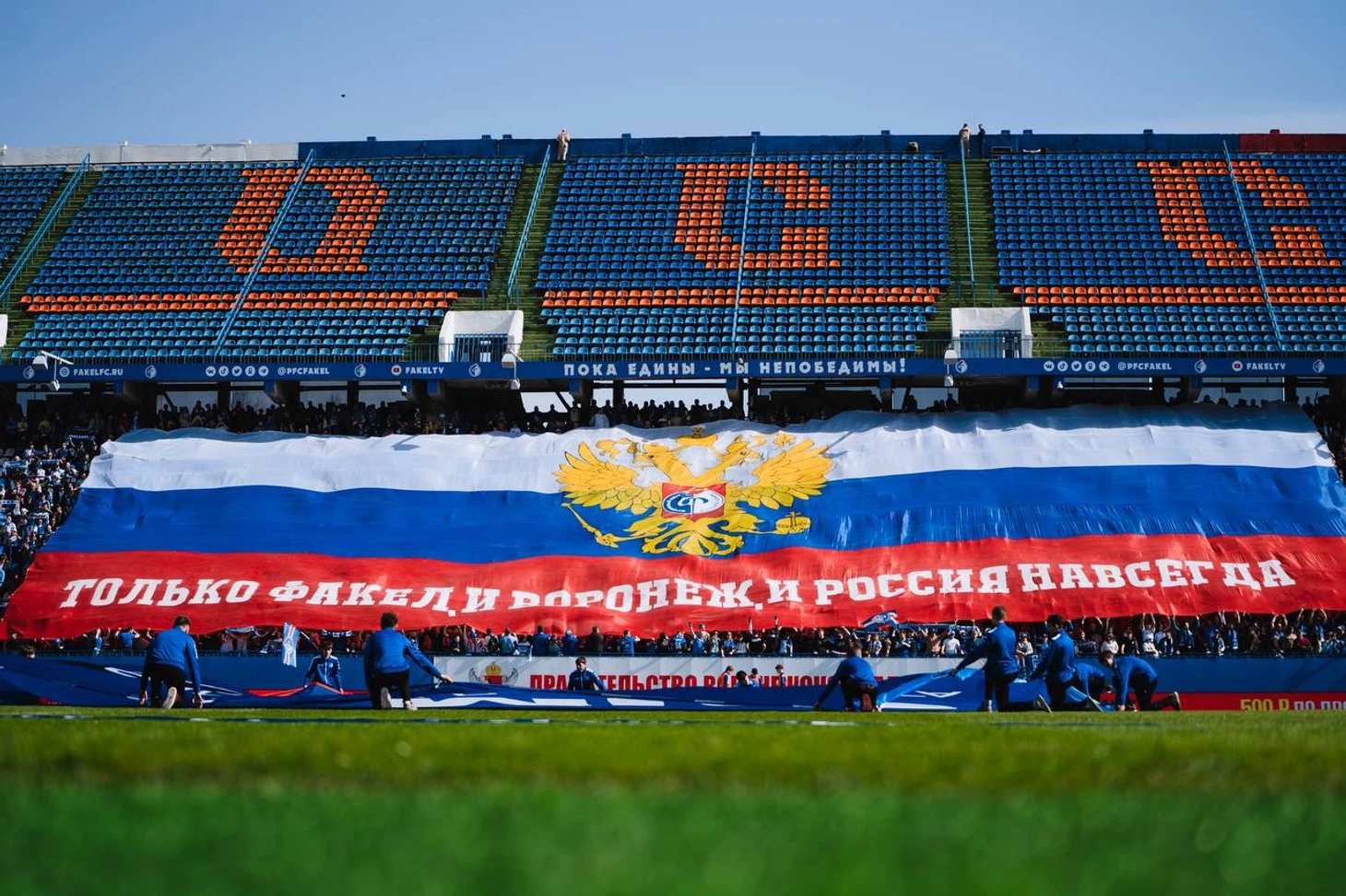 В центре российского триколора был изображён герб нашей страны и эмблема воронежского клуба. Слова на баннере - «Только Факел. И Воронеж. И Россия навсегда» - говорят об особом единении, которое испытывают любители футбола из всего региона. По информации, полученной от пресс-службы «Факела», этот баннер стал самым большим в истории воронежского футбола.