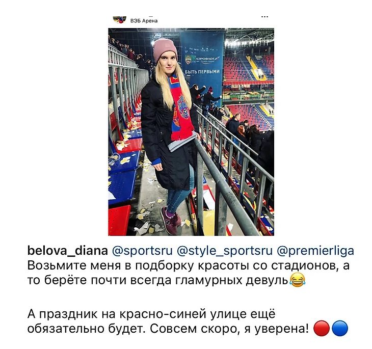 Несколько лет назад Sports в запрещенной соц. сети с картинками после каждого тура РПЛ выкладывал посты «Красота со стадионов», где собирал гламурных, иногда не особо одетых, девиц, преимущественно из вип-лож. Меня, простую болельщицу завернутую в пуховик и три слоя одежды, это немного коробило. Ведь я больше болельщица, чем эти дамы. Я даже писала пост-упрёк 😄 Просмотрели одну красотку!