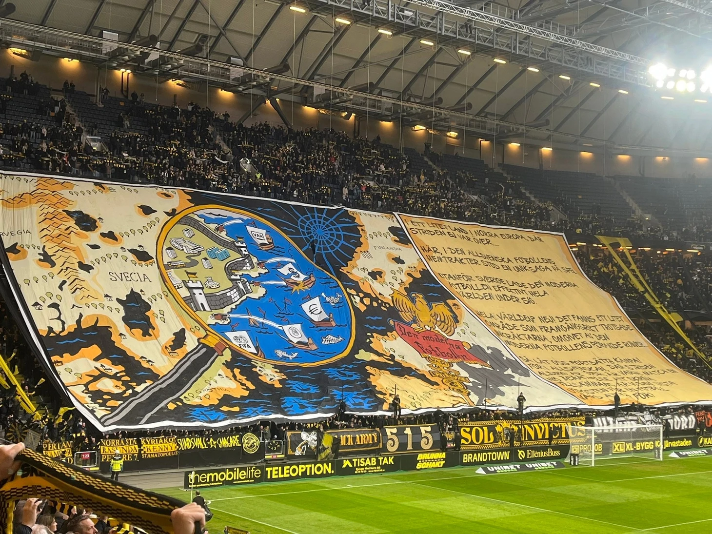 Шикарно прорисованный перформанс от ультрас стокгольмского «АИКа» на первом матче нового сезона. Баннер направлен против современного футбола – пушки из крепости «АИКа» топят корабли со знаками евро и доллара, а также логотипами ВАРа, ФИФА и УЕФА.