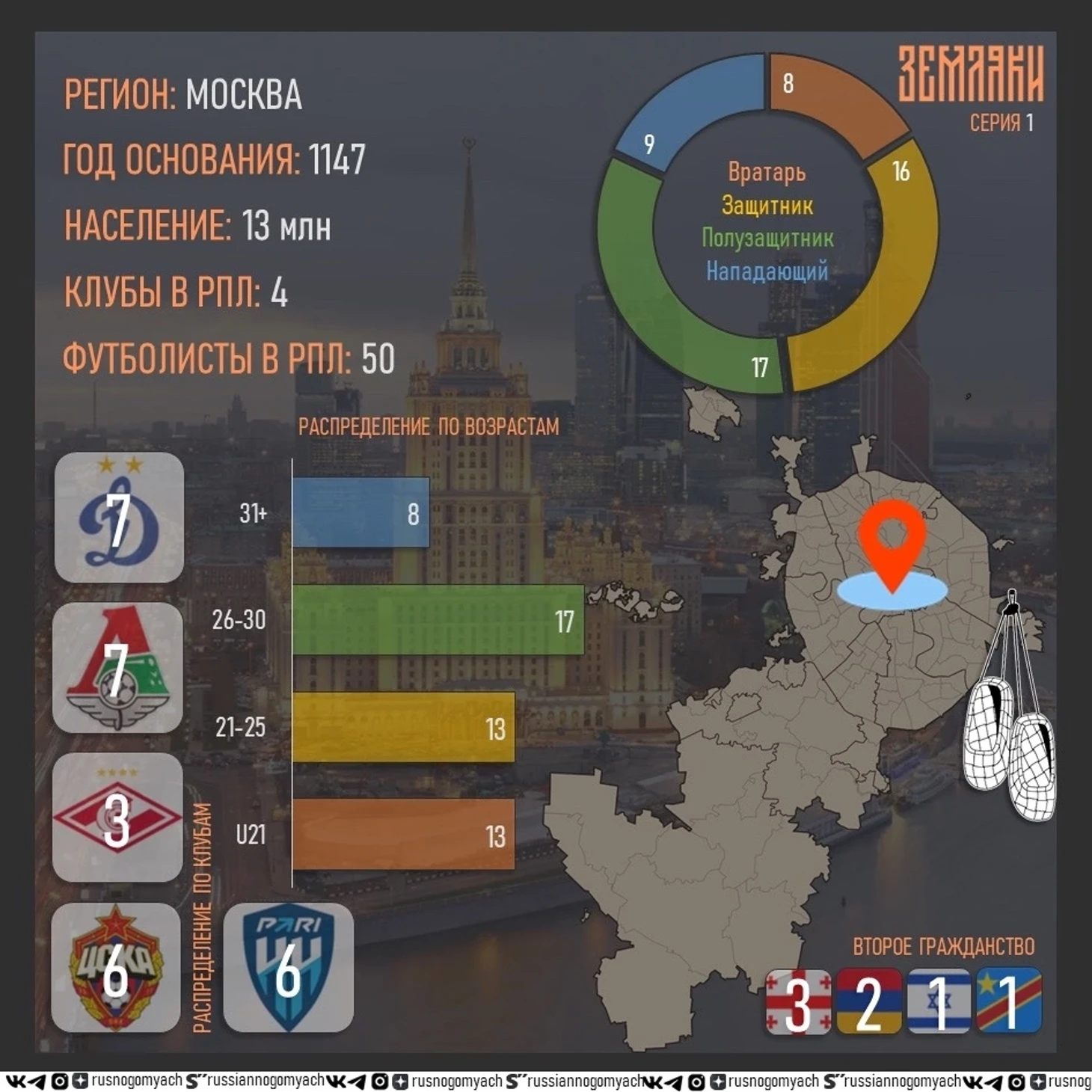 Начнем, конечно, со столицы - тут и народу больше всего и с клубами нет проблем (потому как в одном топовом регионе в РПЛ клуба нет).