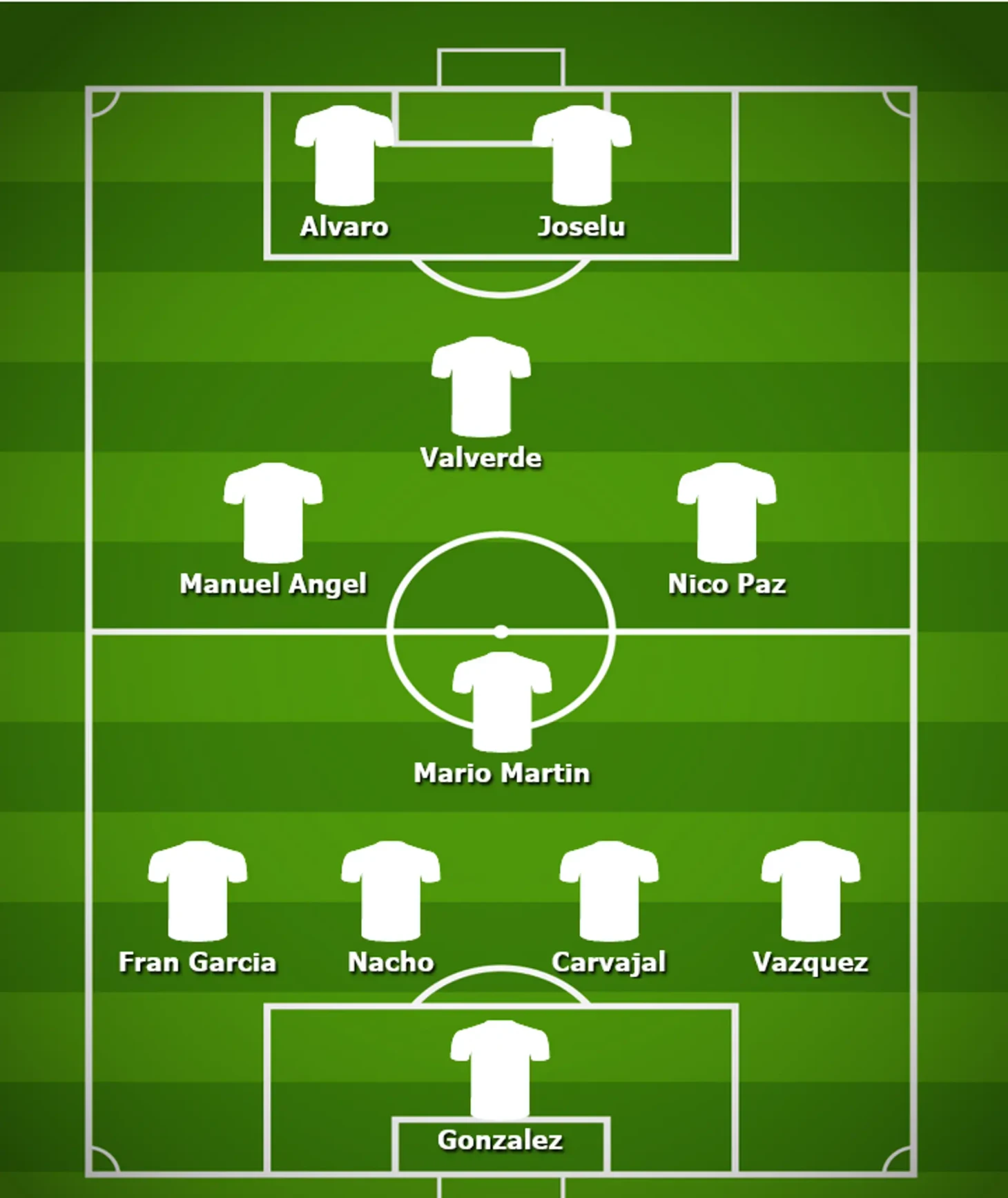 Гонсалес; Фран, Начо, Карвахаль, Васкес; Мартин, Анхель, Нико Пас, Вальверде (и его считаем); Альваро, Хоселу.