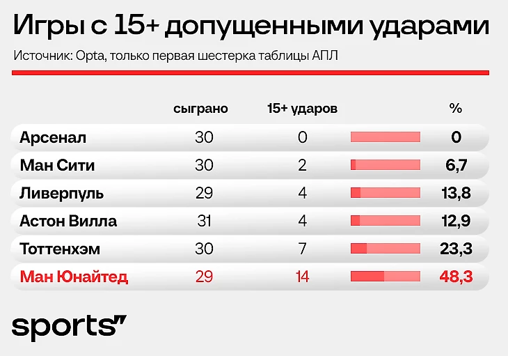 В 17 матчах АПЛ «МЮ» допустил больше 15 ударов. Это почти столько же, сколько у пятерки команд суммарно.