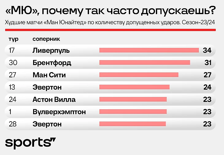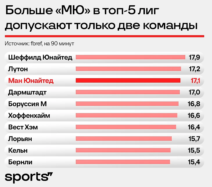 Соперники часто бьют неподготовленно. «МЮ» четвертый в АПЛ по количеству допущенных ударов, но по суммарному xG соперника только седьмой с огромным отрывом от лидера «Лутона» (50,7 против 62,6).