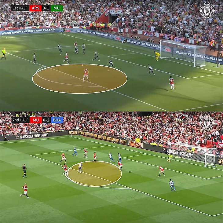 ● В среднем соперники «МЮ» бьют с 15,3 метра − это 11-е место в лиге (лучший «Арсенал», худшая «Астон Вилла»). Но расстояние не равно качество: любовь защиты и Каземиро вжиматься в штрафную, а также дыры в центре оставляют бьющему время и зону для удара.
