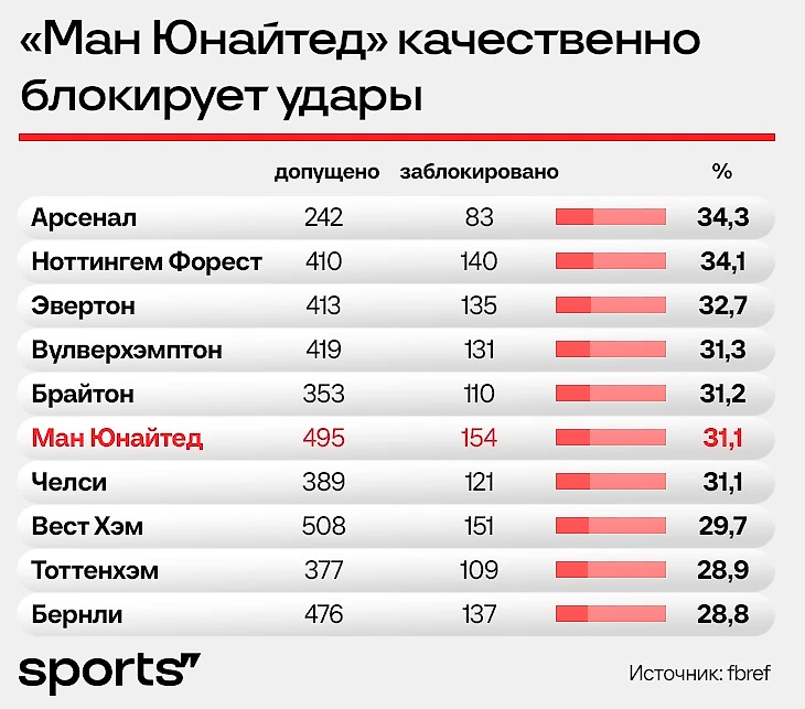 Защитники блокируют треть ударов. В матче с «Брентфордом» мяч всего 5 раз долетел до Онана − защитники совершили девять блоков. По заблокированным ударам «МЮ» лучший в лиге, по проценту тоже в топе.